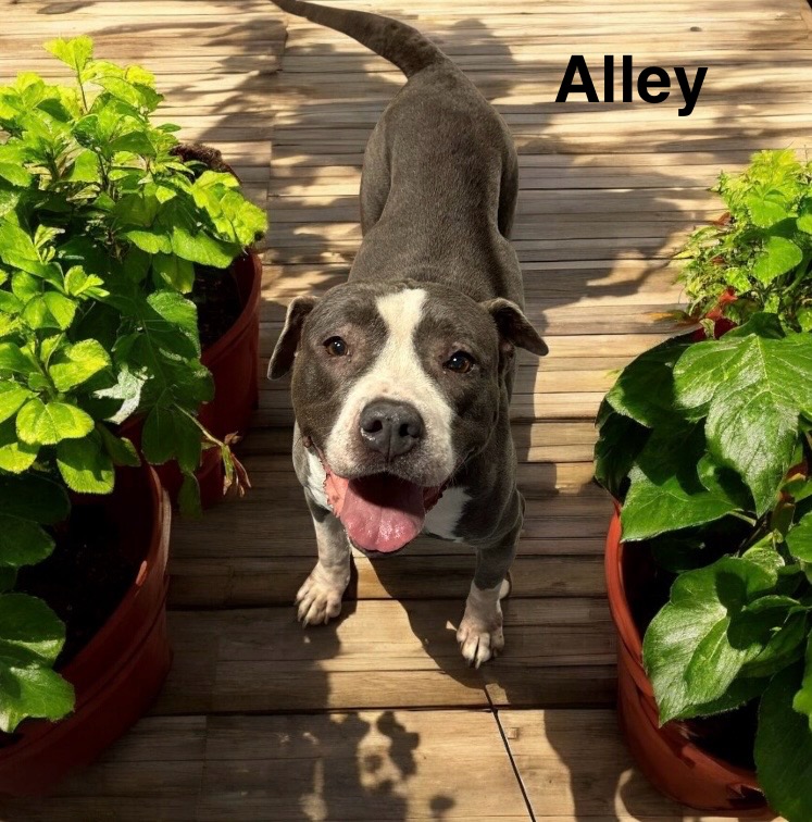 Alley is a 7.5-year-old female American Staffordshire Terrier mix with a heart full of love and a calm, gentle presence. She’s house and crate trained, well-mannered, and ready to be someone’s loyal companion.